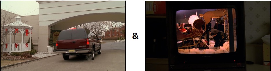 When Tony drives to the Russian club to meet his money launderer, the footage is scored with a high hat and snare drum that sound a bit like sleigh bells, in effect making Tony’s red Suburban seem like a sleigh. That same scored beat is heard when Tony, in Santa hat, tracks down the Russian who attacked Janice. When the Russian is found badly beaten beneath a sleigh in a window-display, it’s as though Santa himself ran the man down:
