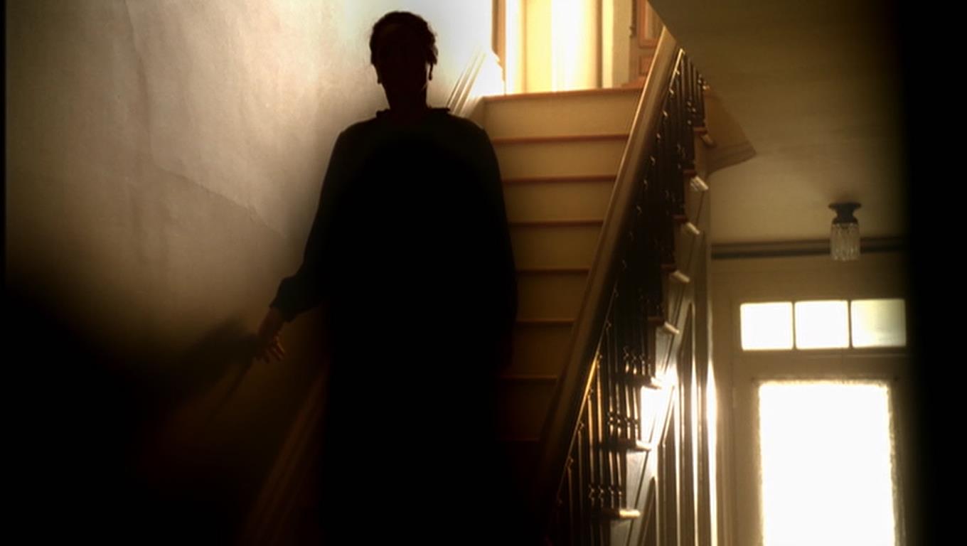 Even looking at the screengrabs side-by-side, it’s difficult to determine whether it’s the same house, just with some trim and detailing changed. (Not that it really matters; it just speaks to the dream-like way that Chase plants his images in our minds. Many viewers were later reminded of this “dream” house when Tony/Kevin Finnerty came upon a similar looking home during his dream/coma/near-death-experience in Season 6’s “Mayham.”) When stonemason Tony pushes the door of the house open, he comes across a surreal image. A shadowy figure stands in the staircase, its dark particles seeming to resolve from out of its ghostly outline and bleed into the surroundings. Is it Livia “rising damp” from her grave? Or, if not her grave, at least from the dark recesses of Tony’s subconscious?