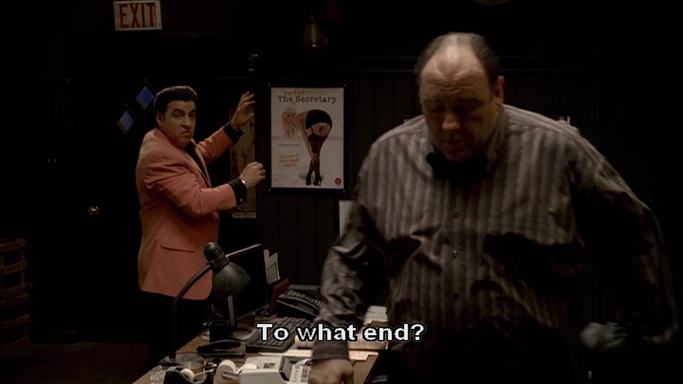 “The gardener should have known better than to get involved with Paulie in the first place. He should have gone to the police. Everything they touch they infest.” Yes, they do. This includes the police. If Sal went to the police what would they do? if the complaint alone did not get Feech violated back to prison, the police would need Sal to press charges. This is where being a made man kicks in. There are a lot of soldiers to put pressure on Sal by threatening him, his family, his business, his customers. Bad things are going to happen an there will be no way to prove who is doing it or why. And this doesn’t include possible political connections to pressure the police to encourage Sal to drop it (remember how Zellman got AJ released). And if Feech did get violated because of Sal’s complaint, he could still be in a world of hurt. That’s how it works and Sal knows it. It’s a rigged game but it’s often safer to play it than to fight it. As a contrast, there may be a desire to equate corporate America with organized crime, but as Patsi found out, a corporation with 10,000 outlets and computerized data collection can have an immunity from protection shakedowns that small businesses and unconnected individuals do not have. Patsi’s line, “It’s over for the little guy” may apply to the street criminal more than the small businesses he preys on. Crime moves to higher levels. Individuals are no longer victimized directly, it is society that is victimized and the loss is shared by all. As such, it is hard to account for and hardly felt. It becomes just another part of the “fuck’in regularness of life”.