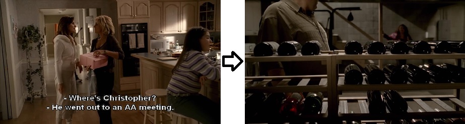 Kelli says that Chris won’t be attending dinner at the Soprano house because he has got an AA meeting. Chase cuts to Tony rotating the wine bottles in his basement; it was after robbing some of these bottles from The Vipers that Tony prodded Chris back on to a path of substance abuse: