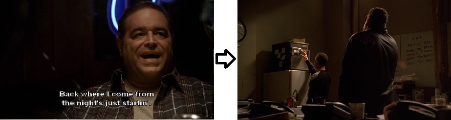 Vito tells the guys in Dartford that back where he is from, the night is just beginning. Chase cuts to New Jersey, where Bobby Bacala collects a payment from a bookie late at night and then gets robbed. The edit highlights the irony: Vito wants to leave Dartford with its boring—but safe—nights to go to Jersey with its very dangerous nights: