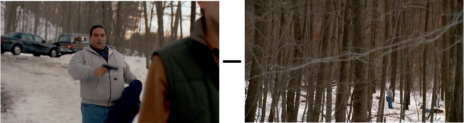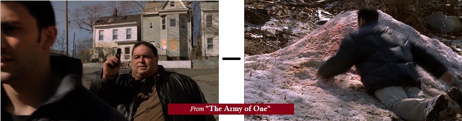 Vito may believe that he can return to the mob on his own terms (and Sinatra’s “My Way” playing on his car radio seems to underscore this) but his return will not be easy. He runs into his first obstacle—literally—soon after leaving Dartford: Vito crashes into the back of a Jeep Wagoneer. The New Englander who owns the Jeep is unwilling to accept cash for the damage, he wants to get the insurance company and police involved. So Vito decides to install a new window in the back of the unfortunate man’s head. We’ve seen Vito shoot someone from behind before: this is how he killed Jackie Aprile in episode 3.13. The New Englander falls face-first into the snow, just as Jackie did. By echoing the earlier imagery, Chase emphasizes that Vito Spatafore is already returning to Business As Usual: